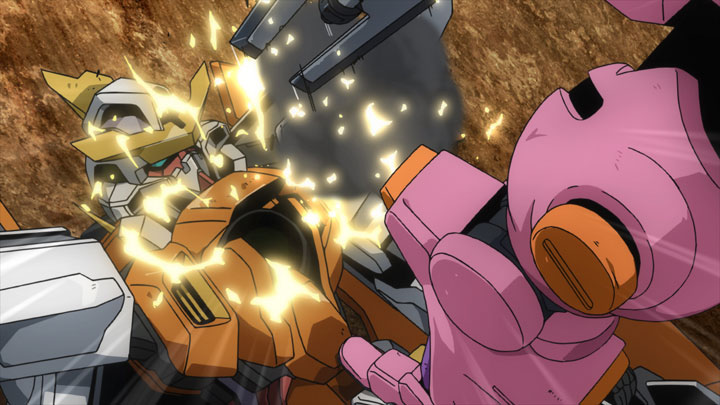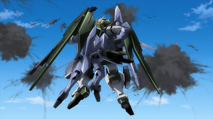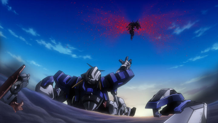 Le Kyrios est aux mains de Soma. Le Dynamès est réduit à l'état de belle au bois dormant dans les bras du Flag de Graham, ce qui lui fait bien vite oublier la perte de cet imbécile de Joshua... Les jeux semblent faits pour Celestial Being. Dans sa fuite, l'Exia tombe sur l'Agrissa, Mobile Armor piloté par Ali Al Saachez ! Le combat n'a pas commencé que Setsuna a déjà perdu. Marina s'inquiète pour lui. Il pense son heure venue et revoit le Gundam, il l'invoque... Jusqu'à ce que du ciel surgissent des rais de lumière rouge salvateurs. Peinant à y croire, Setsuna tend la main comme pour le toucher... C'est un Gundam !