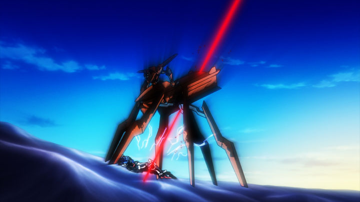 Ali Al Saachez tient l'Exia dans les griffes de son Agrissa. La décharge de plasma de ce Mobile Armor inflige souffrance à Setsuna tandis qu'il prie pour être sauvé. Il prie alors qu'Ali lui souhaite la mort. Il prie jusqu'à ce que des éclairs rouges descendent du ciel et viennent foudroyer son bourreau. A cet instant se dresse fièrement dans le ciel bleu un Mobile Suit rouge entouré d'un nuage scintillant. Setsuna et sa machine tendant la main vers lui, vers leur sauveur... Un Gundam ! C'est le Gundam Throne Drei, piloté par une jeune fille : Nena Trinity, Gundam Meister, comme ses deux frères...