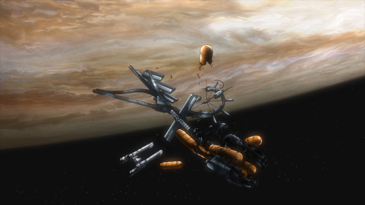 80 ans auparavant, des spationautes se fraient un passage dans une épave à l'abandon. Malheureusement pour eux, les informations qu'ils y cherchent sont absentes, probablement effacées à dessein peu avant que n'arrive l'incident qui a conduit le navire à sa perte... Ils ne repartiront néanmoins pas les mains vides, au terme d'une quête de six ans, puisqu'ils trouveront un terminal d'accès semble-t-il encore intact. Ce terminal ressemble à un jouet, à un Haro violet. La mission de ces explorateurs est désormais remplie. Ils peuvent quitter l'orbite de Jupiter pour rejoindre la Terre...