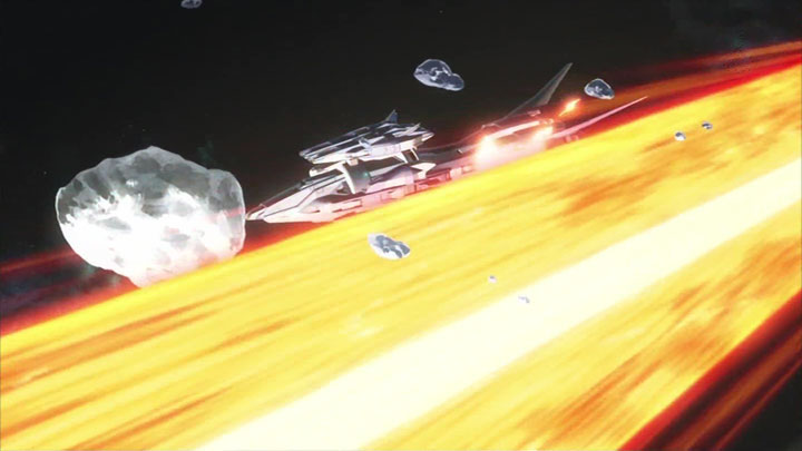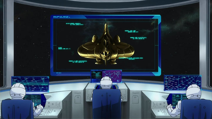 Setsuna et Lasse partent à bord du container d'assaut tandis que le Nadleeh et le Kyrios restent pour défendre le navire. Mais ces derniers se retrouvent très vite débordés par les GN-X ennemis. Qui plus est, le MA ennemi, l'Alvatore, se montre insensibles aux offensives de Celestial Being, et arrose le champ de bataille de ses lasers. Conséquences : le Kyrios est à moitié déchiqueté (même avec Hallelujah aux commandes), le Nadleeh se retrouve exposé puis dérive dans l'espace et le Ptolemaios a perdu le docteur Moreno. Sumeragi décide alors d'aller au container d'assaut restant au navire avec Ian pour utiliser ses armes.